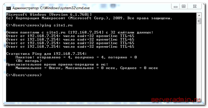 Теперь выполним ping site1.ru, чтобы проверить, как сервер поддерживает нашу зону: