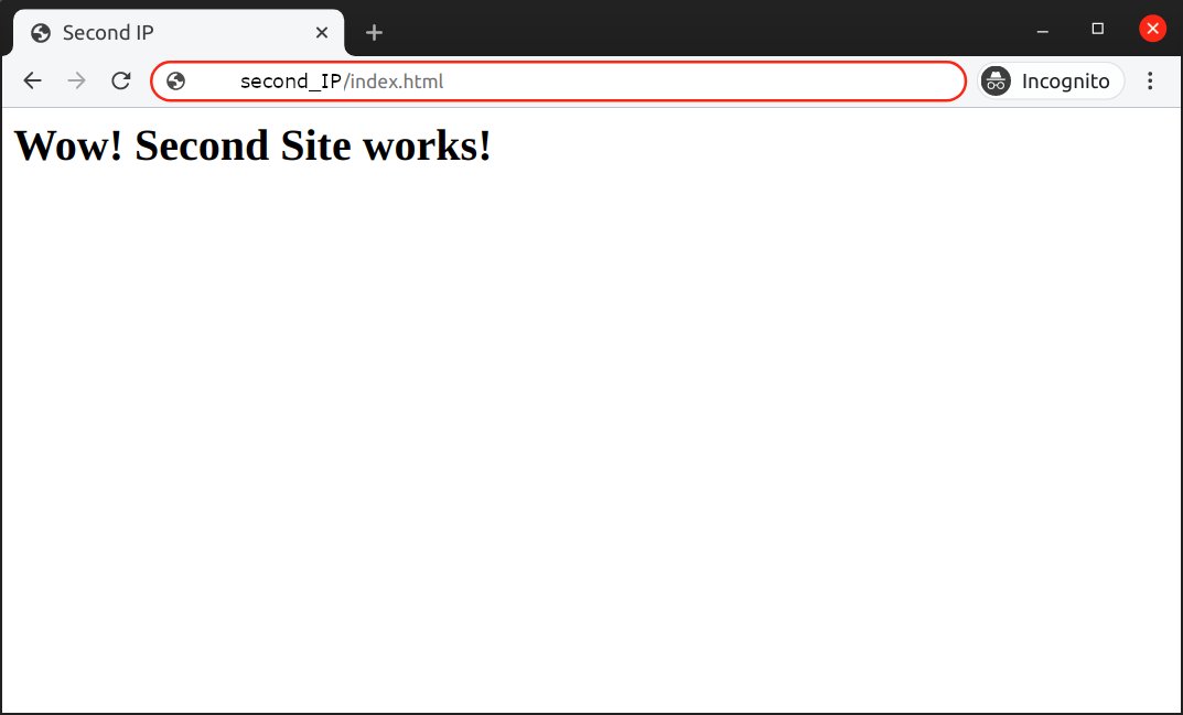 Теперь Apache должен обслуживать сайты, IP-адреса или домены которых мы прописали в виртуальных хостах. Проверим работу: перейдем в браузере на сайты — должны появиться созданные индексные страницы: