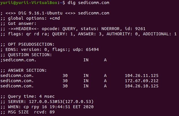 Команда dig может использоваться для запроса доменного имени и получения информации: