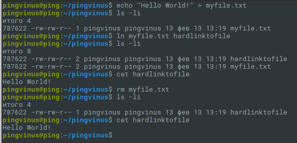 Например, создадим жесткую ссылку с именем hardlinktofile на файл myfile.txt: