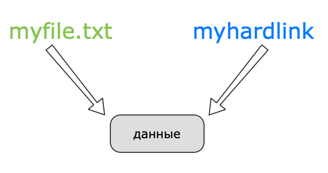 Схематично отношение между исходным файлом, жесткой ссылкой и данными можно показать следующей схемой: