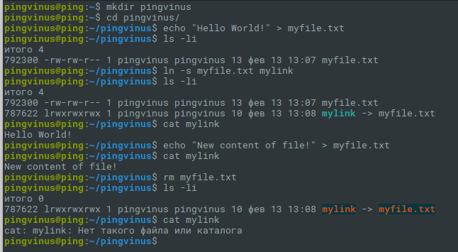 Например, создадим в текущем каталоге символическую ссылку с именем mylink на файл /home/pingvinus/myfile: