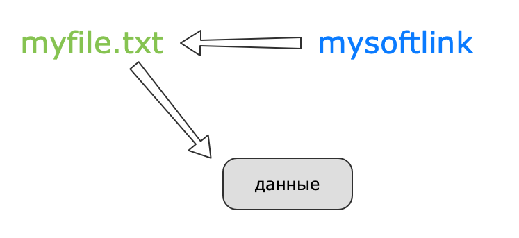 Схематично отношение между файлом, символической ссылкой и данными, которые хранятся в файле, можно показать следующим образом: